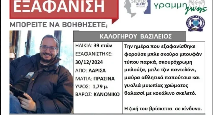 Ο άνδρας ήρθε για τις γιορτές στους γονείς του στη Λάρισα, αλλά έχει να δώσει σημεία ζωής από την προηγούμενη Δευτέρα, όταν κι έφυγε από το σπίτι για μια βόλτα.